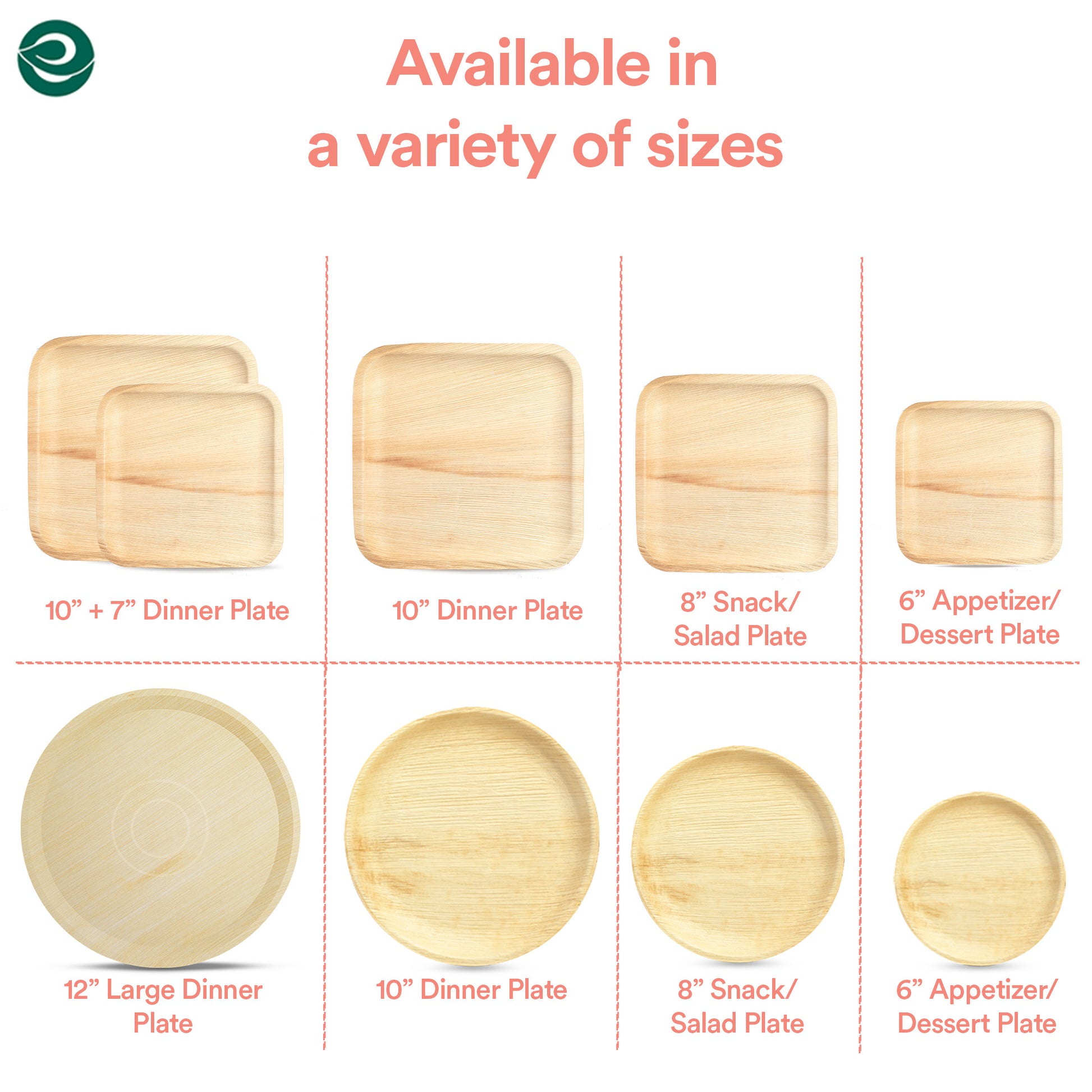 You will receive Palm leaf plates in two dimensions: 7 inches and 10 inches, both square in shape. These plates are excellent choices for serving full-course meals and snacks. They are sturdy, waterproof, and compostable.