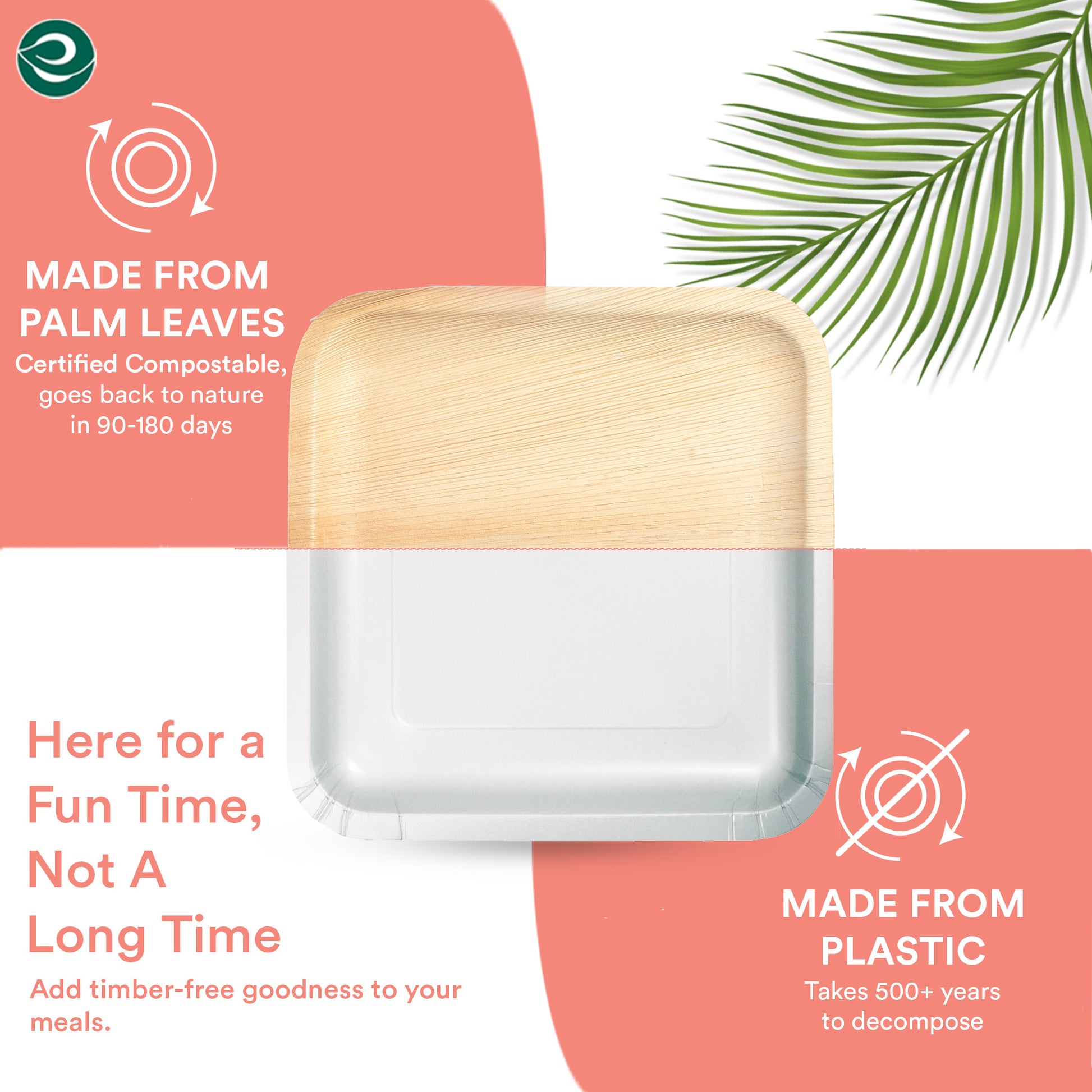 Composting is a natural process where organic materials break down in soil, enriching it. Items like food scraps, leaves, and wood are compostable. Surprisingly, our palm leaf plates are also certified for composting. To compost at home, add our plates to your compost pile with twigs or leaves and let them decompose; they compost within 90-180 days. Once ready, mix the compost with your soil for nourishment. If you lack a backyard, use a designated compost bin. In landfills, compost naturally returns to nature.