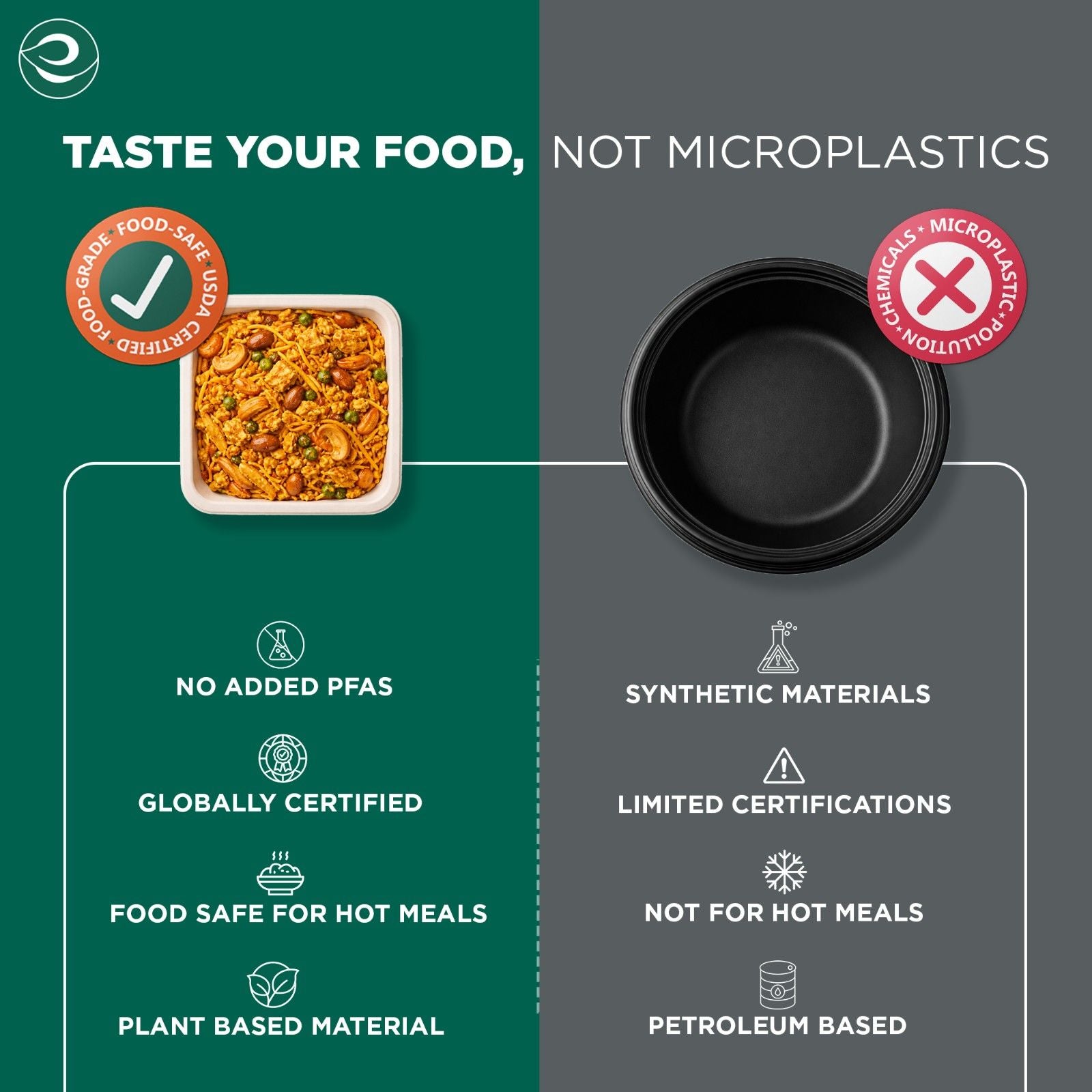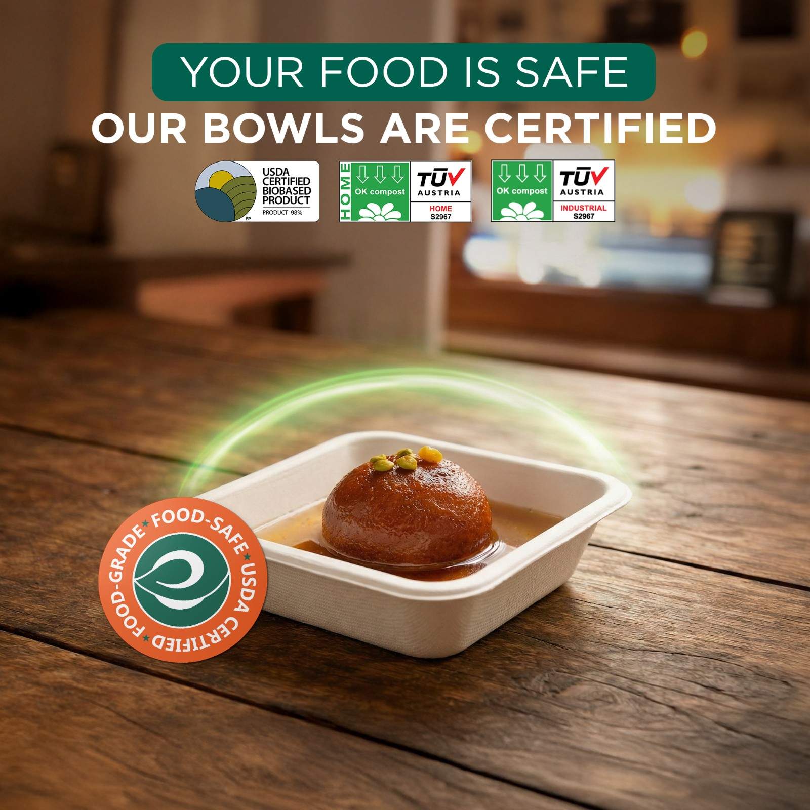 Our square compostable bagasse bowls are home- and industrial-compostable. With the right conditions, they break down into nutrient-rich compost within 90–180 days after disposal.