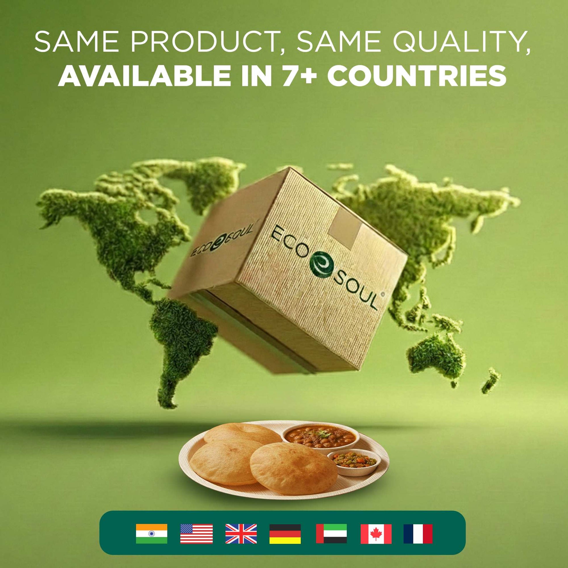 Palm leaf plates at EcoSoul are crafted from naturally fallen Areca palm leaves. These leaves are gathered, cleaned, and air-dried. Once fully dried, they are meticulously stretched and flattened by hand. Finally, they are shaped using heated presses to achieve the desired form.